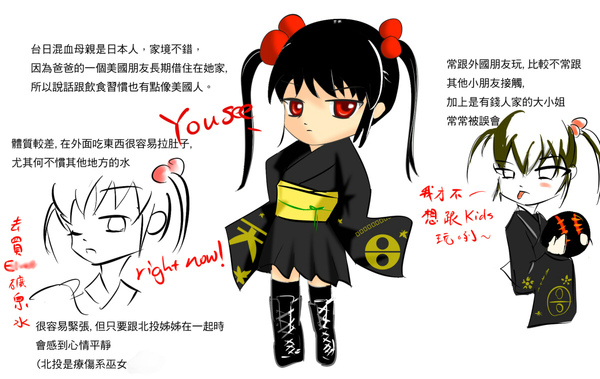 設定上是台日混血,身體嬌弱又有一點大小姐性格的蘿莉,說話常常夾雜著英文